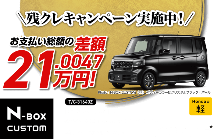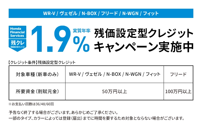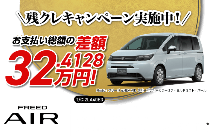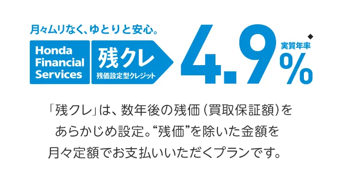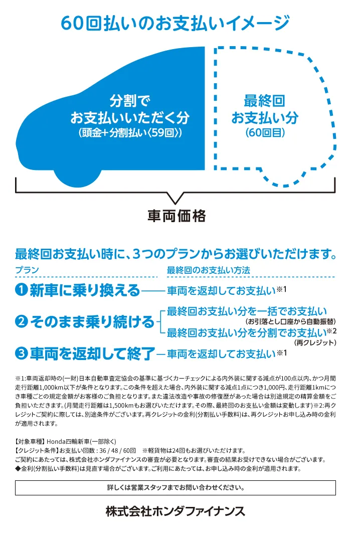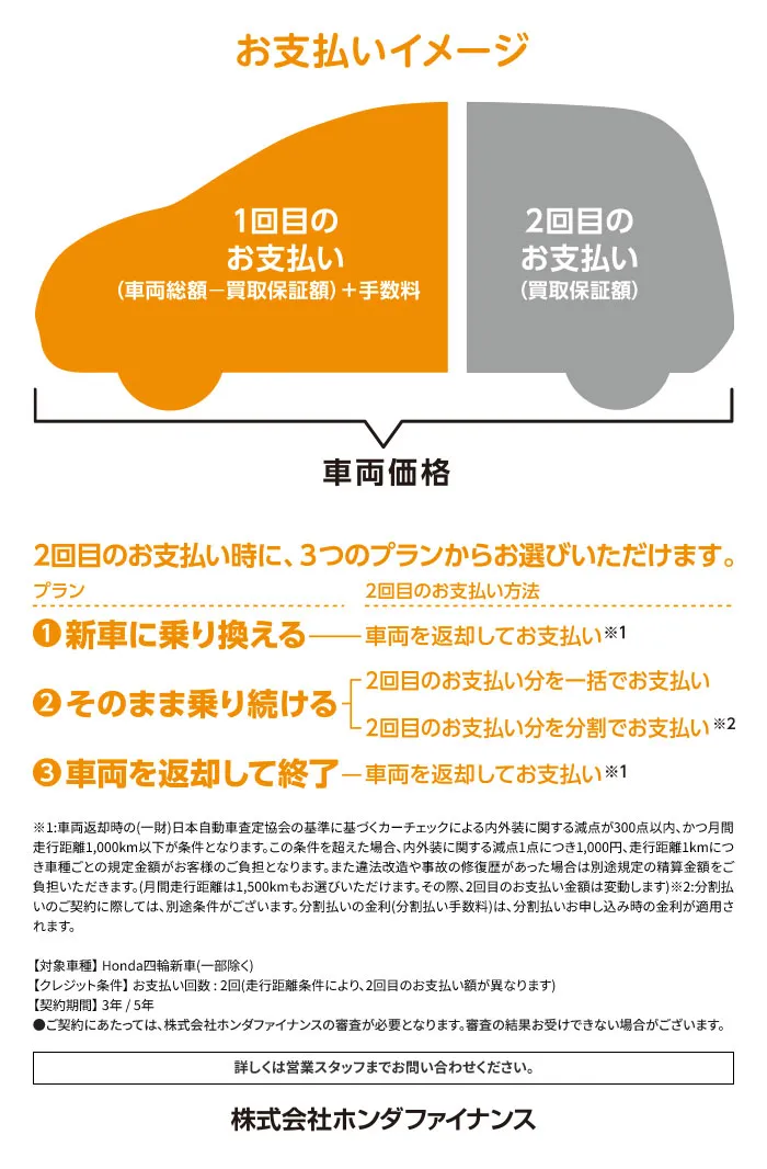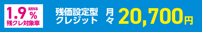 (残価設定型クレジットのお支払い例について)・上記お支払い例は2025年12月の一例です。・上記お支払い例は、初回お支払い月を2026年2月、初回ボーナス月を2026年8月(以下ボーナス月は1月・8月)で計算した一例です。※本クレジットは最終回に、@新車に乗り換えA乗り続ける(最終回お支払い額を一括または再クレジットでお支払い)B車両を返却 のいずれかをお選びいただけます。@、Bの場合、内外装キズや走行距離などの確認事項があります。事前に定めた条件を超える場合には、その差額分を別途ご負担いただきます。詳しくは営業スタッフまでお問い合わせください。